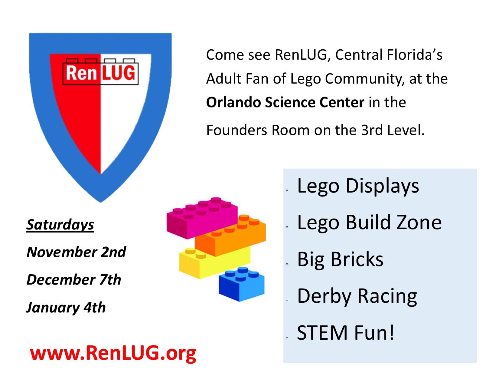 RenLUG brings Adult Fans of LEGO® (AFOLs) together to build, learn, and share through collaborative creations, public exhibitions, and community partnerships across Central Florida.