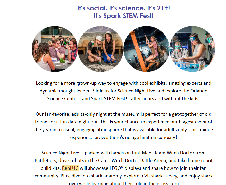 - Saturday, February 15th – Spark STEM Fest After Dark Science Night Live (21+ only event) at Orlando Science Center – This is the 21+ version of Spark STEM Fest, with bars and leveled-up programming throughout the building. RenLUG’s exhibit: