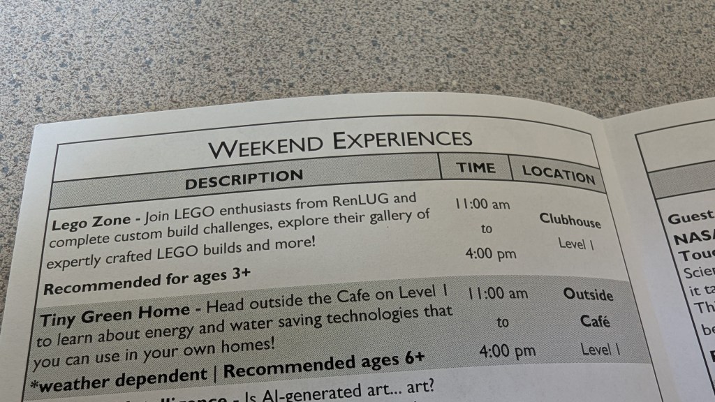 - Saturday, May 31st – Science Night Live – A 21+ evening event! OSC after dark is home to guest speakers, food and drink offerings, and an completely adult audience. – Join RenLUG in the Club House for an evening of medieval mayhem and high-speed thrills! Witness epic LEGO® creations and take the wheel in our RenLUG Royal Rally Racing—a knightly twist on LEGO® derby track racing.